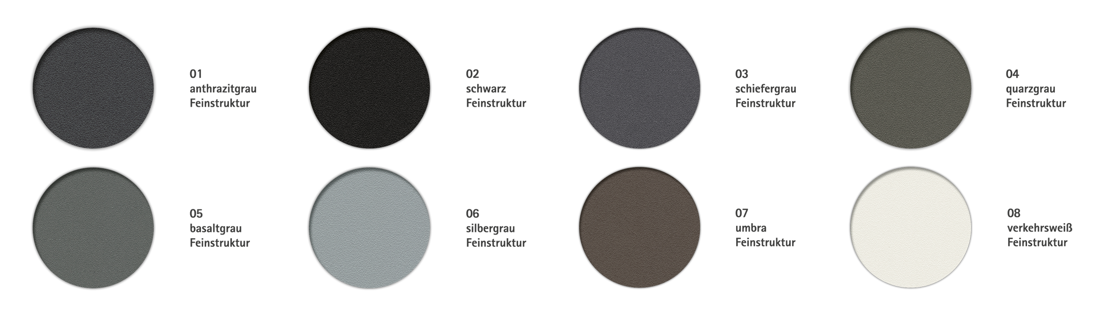 Barvna paleta VEKA Fine Structure vključuje osem barv za okna, ki so trenutno v modi: antracitno sivo, skrilasto sivo, bazalt sivo, umbra, črno, kremenčevo sivo, srebrno sivo in prometno belo. To pomeni, da nove površine še posebej dobro izgledajo – vendar ne samo – v sodobni arhitekturi za oblikovalsko ozaveščene lastnike stavb.